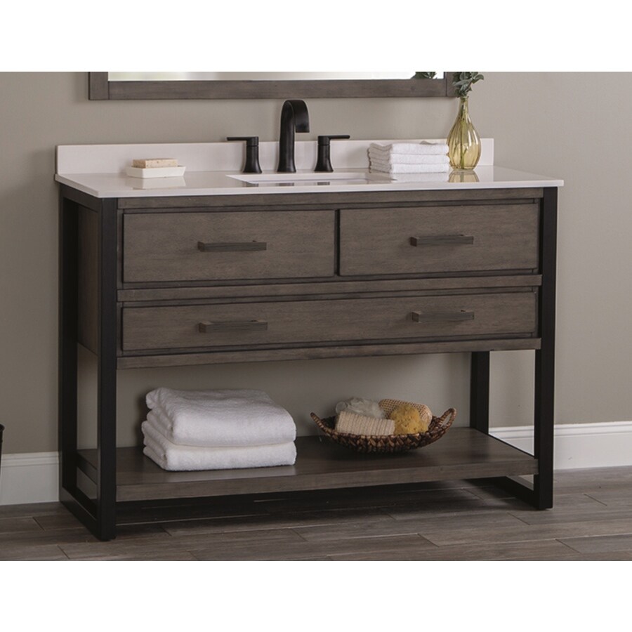 Buy allen + roth Belluno 48-in Tawny Single Sink Bathroom Vanity with White Engineered Stone Top. Belluno Tawny vanitybo featuring a wired brush technique that enhances the rustic charm. Outlined with a steel frame and matte black hardware. Open shelving with three soft close drawers will provide storage withoutpromising style.