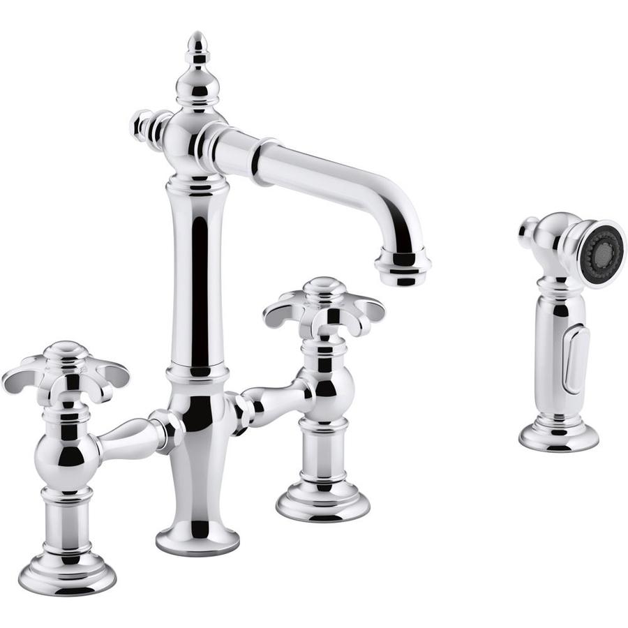 Buy KOHLER Artifacts Polished Chrome 2-Handle Deck Mount Bridge Residential Kitchen Faucet. The Artifacts faucet collection brings you classic designs reimagined in fresh new ways for various task areas of the kitchen. Featuring apact profile ideal for a secondary sink, this Artifacts bridge faucet celebrates vintage style with its six-prong handles and Victorian-inspired swivel spout. A convenient sidespray lets you switch from gentle BerrySoft spray to powerful Sweep spray at the touch of a button, so you're set for food prep as well as quick cleanup.