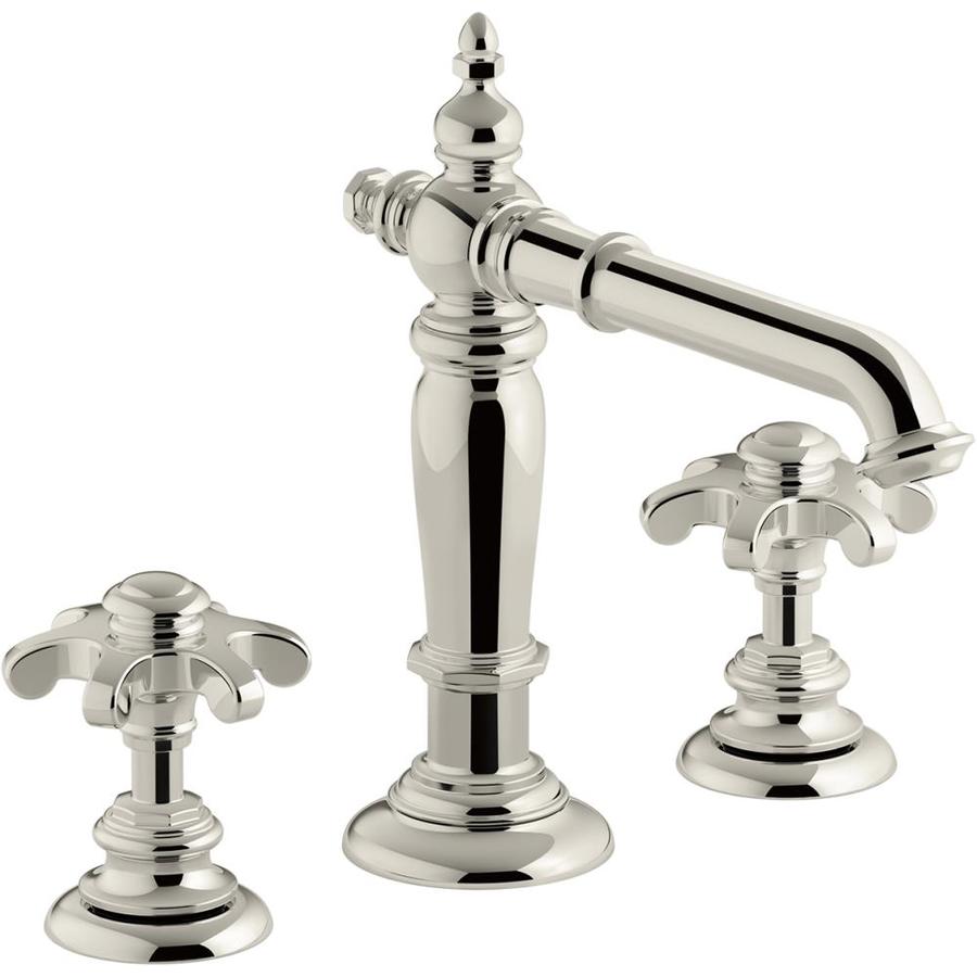 Buy KOHLER Artifacts Vibrant Polished Nickel 2-Handle Widespread WaterSense Bathroom Sink Faucet with Drain. Create a look all your own with the Artifacts collection. Timeless and classic in its inspiration, Artifacts allows you to coordinate faucets, accessories, showering, and finishes to express your personal style. Artifacts faucetsbine quality craftsmanship with artisan designs to lend character and authenticity to your space - as a finishing touch or the central piece to build the room around. This Victorian-inspired bathroom sink spout features an elegant column design.