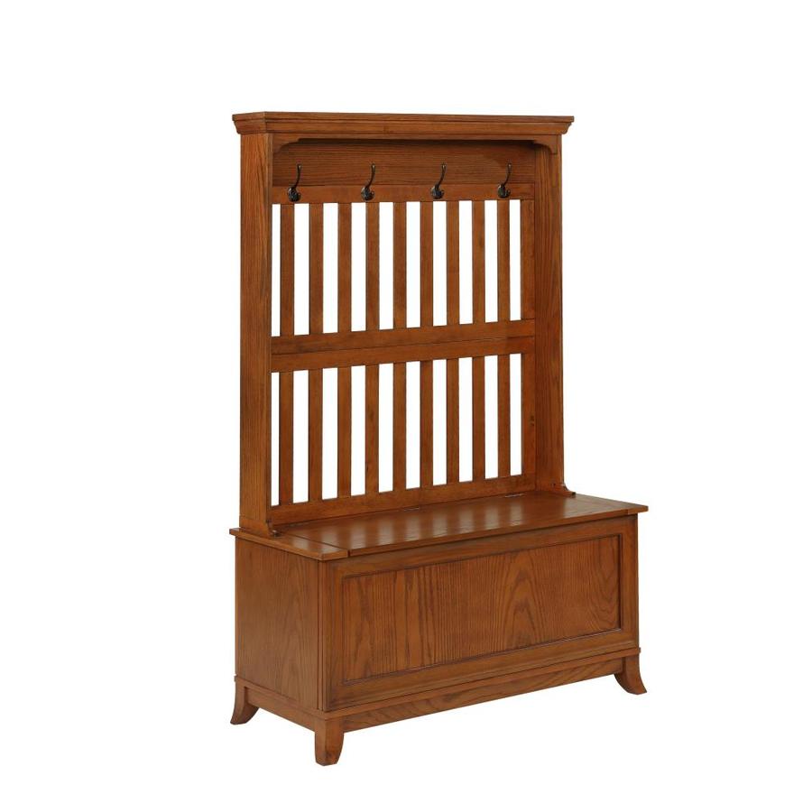 An easy storage solution, the Oakdale hall tree adds to fashion and function to your home décor. This multi-functional piece has a moulding on the top shelf, four mounted hooks, and a hinged storage seat. The warm oak finish sets off the open slat back design and features recessed panels and the slightly flared legs. Safety is a priority with child safe hinges and breath holes. Some assembly required.